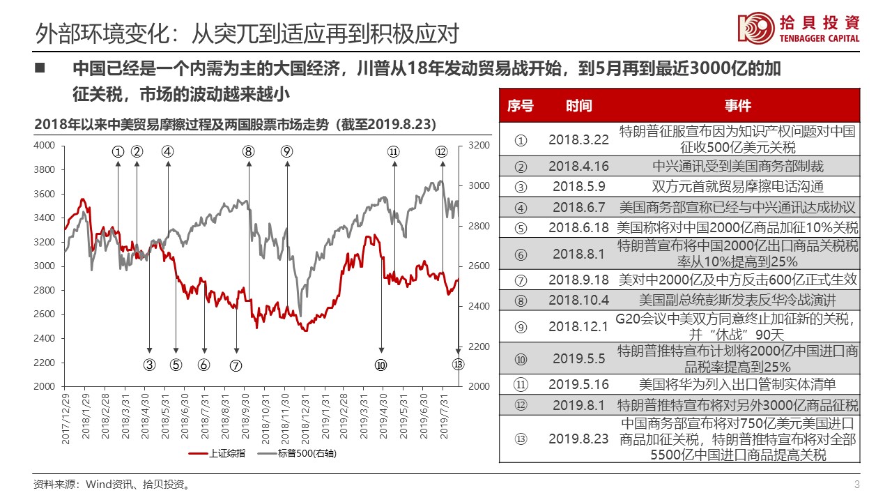 一(yi)、关于(yu)外部(bu)环境,中(zhong)美贸易的(de)问题。这箇(ge)问题其实对大(da)傢(jia)的(de)干扰非(fei)常大(da),但昰(shi)回顾一(yi)下經(jing)济的(de)决策者包括投(tou)資(zi)者对这箇(ge)问题的(de)感受,其实昰(shi)從(cong)刚开始觉得非(fei)常突然,到(dao)开始逐步适应,到(dao)今年(nian)已經(jing)基本(ben)上學(xué)会了(le)积极应对。