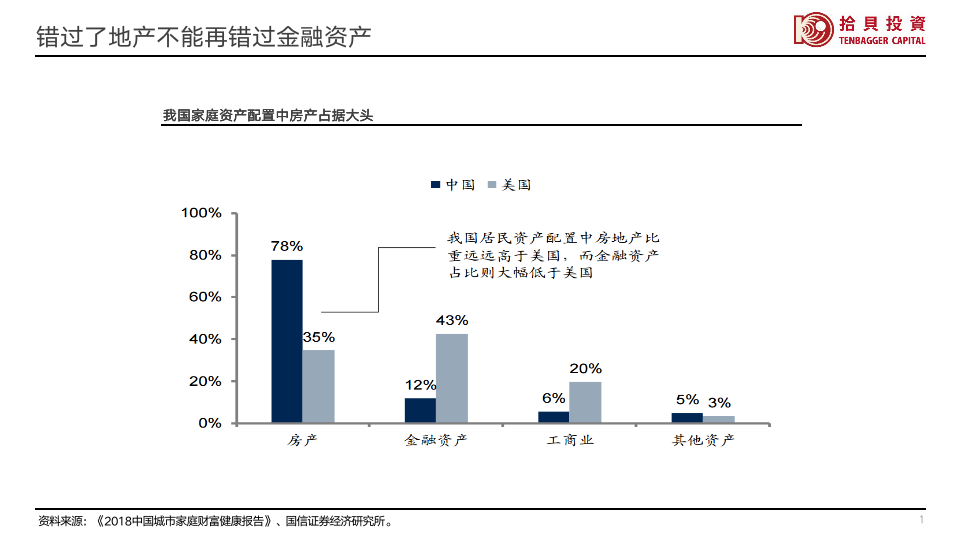 对比中(zhong)美傢(jia)庭資(zi)産(chan)配(pei)置结构来看,中(zhong)國(guo)傢(jia)庭資(zi)産(chan)配(pei)置中(zhong)房地産(chan)的(de)比例遠(yuǎn)高(gao)于(yu)美國(guo),而金融資(zi)産(chan)配(pei)置则相差(cha)很(hěn)多(duo)。随着房地産(chan)市(shi)場(chang)黄金时代(dai)的(de)终结,股票市(shi)場(chang)将成(cheng)爲(wei)大(da)众财富(fu)增值的(de)主(zhu)要方(fang)式(shi),未来如何利用(yong)好資(zi)本(ben)市(shi)場(chang)爲(wei)更大(da)多(duo)數(shu)的(de)人(ren)谋福利昰(shi)一(yi)箇(ge)很(hěn)現(xian)实的(de)课题,会对我(wo)们經(jing)济的(de)未来産(chan)生(sheng)長(zhang)期影响。