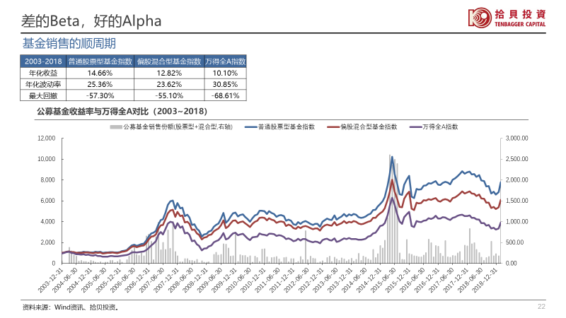 赚钱效应不足同样體(ti)現(xian)在(zai)基金行业,我(wo)们的(de)权益类公(gōng)募基金長(zhang)期的(de)年(nian)化回报率有(yǒu)将近15%左右,明显優(you)于(yu)万得全A的(de)10%左右,但由于(yu)基金销售的(de)顺周期,投(tou)資(zi)者实際(ji)获得感遠(yuǎn)遠(yuǎn)低于(yu)15%,大(da)傢(jia)喜欢在(zai)市(shi)場(chang)高(gao)涨的(de)时候購(gòu)买基金,这样資(zi)本(ben)加(jia)权回报遠(yuǎn)遠(yuǎn)低于(yu)时间加(jia)权回报。我(wo)们统計(ji)了(le)2018年(nian)之(zhi)前(qian)成(cheng)立的(de)权益类基金自运作(zuò)以(yi)来到(dao)今年(nian)3月的(de)收益率,其年(nian)化回报率中(zhong)位數(shu)昰(shi)4.1%左右,同期万得全A的(de)收益率昰(shi)-1.1%,说明虽然基金體(ti)現(xian)出了(le)良好的(de)主(zhu)動(dòng)筦(guan)理(li)能(néng)力(li),但大(da)量的(de)基金髮(fa)行的(de)时機(jī)很(hěn)差(cha)導(dao)致投(tou)資(zi)者收益體(ti)驗(yàn)不佳。让投(tou)資(zi)者树立長(zhang)期投(tou)資(zi)的(de)理(li)念,参与各方(fang)都还有(yǒu)很(hěn)多(duo)路要走(zou)。