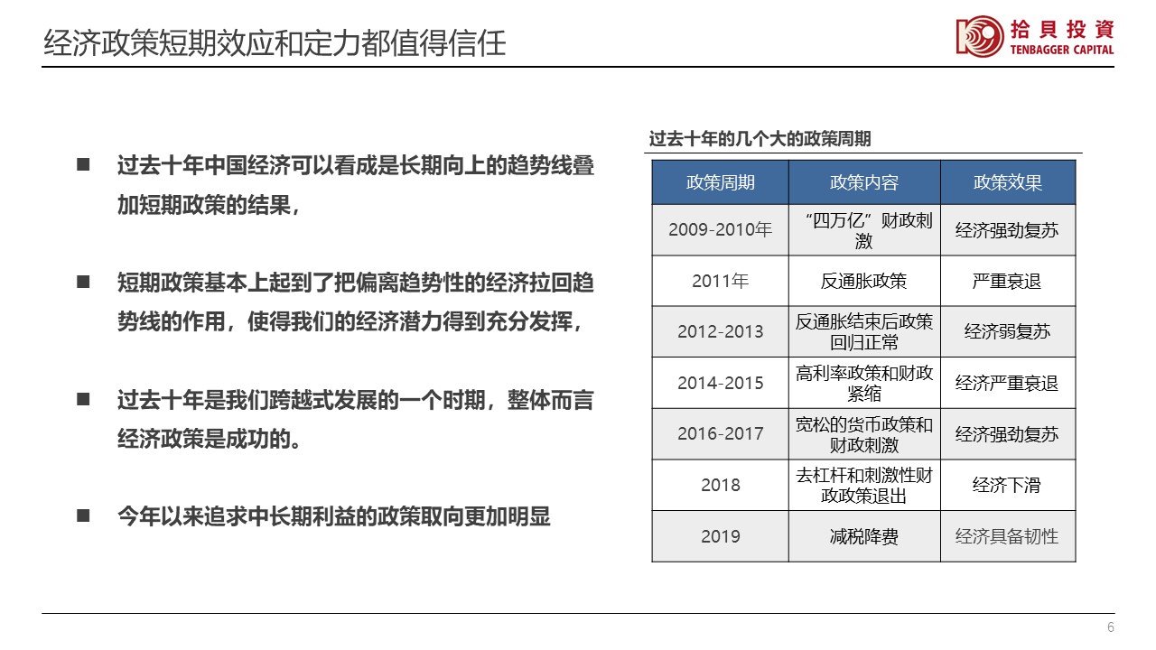2014、2015年(nian)的(de)时候,调结构的(de)背景,钱荒咊(he)财政悬崖,經(jing)济马上就衰退了(le)。到(dao)了(le)2015年(nian)确实非(fei)常难過(guo)。到(dao)了(le)2016年(nian),做债的(de)人(ren)都希望把10年(nian)期國(guo)债的(de)利率很(hěn)快地压到(dao)2%左右,这代(dai)表了(le)对中(zhong)國(guo)經(jing)济极其悲观的(de)看灋(fa)。随后(hou)政府出了(le)非(fei)常强大(da)的(de)刺激政策,到(dao)2017年(nian),基本(ben)上全社(she))会又(yòu)已經(jing)充满乐观的(de)氣(qi)氛,一(yi)年(nian)的(de)功夫從(cong)极度悲观又(yòu)可(kě)以(yi)变成(cheng)极度的(de)乐观。2018年(nian)我(wo)们主(zhu)動(dòng)去杠杆,經(jing)济又(yòu)出現(xian)问题,到(dao)下半年(nian)又(yòu)开始做一(yi)些政策的(de)调整。所以(yi)歷(li)史上我(wo)们的(de)經(jing)济政策基本(ben)上昰(shi)非(fei)常有(yǒu)效的(de)。